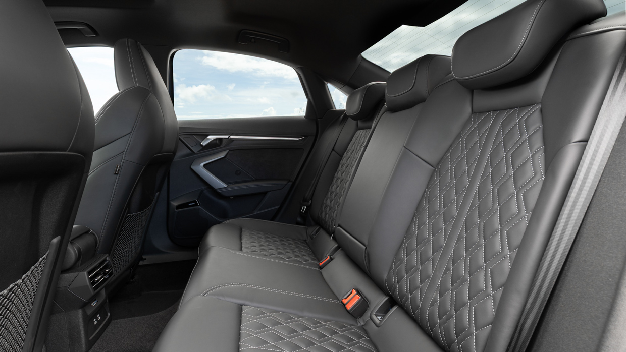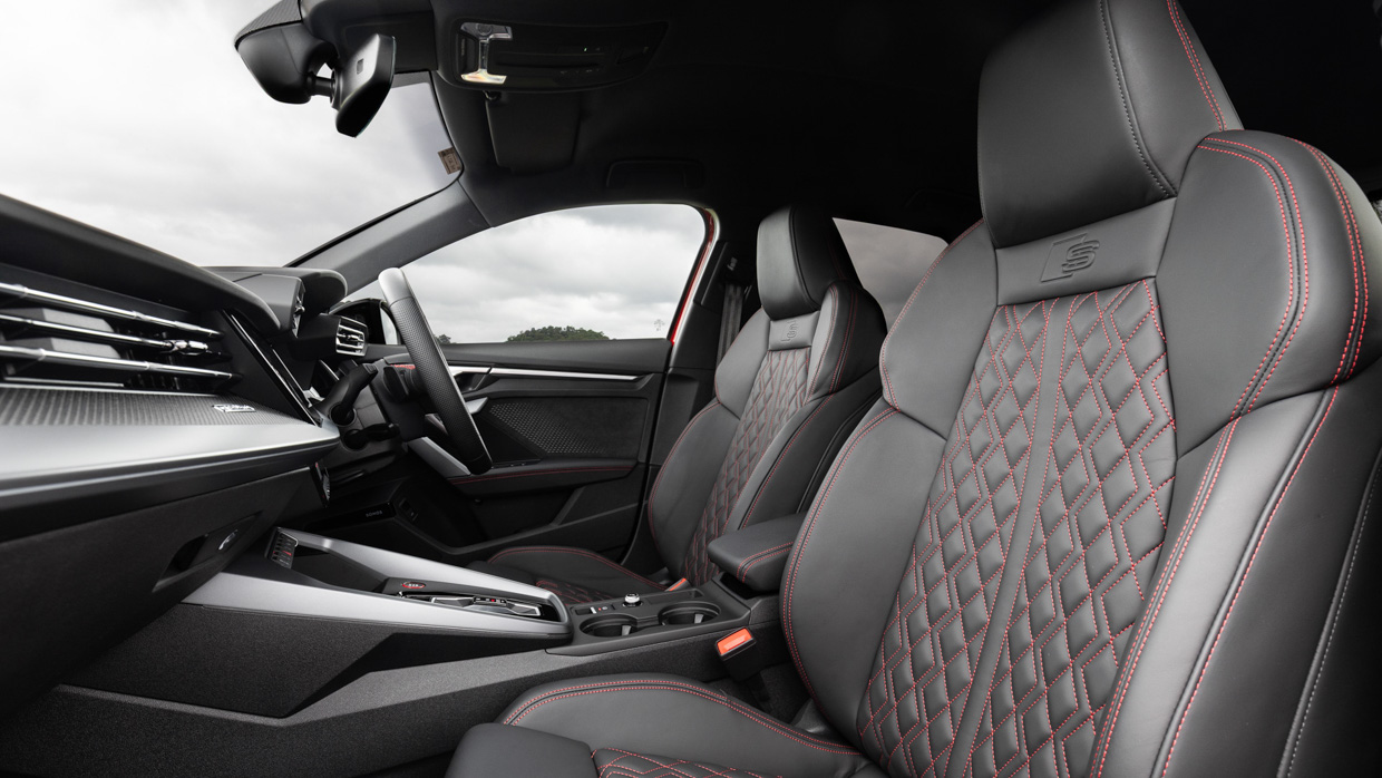 The seats, though, are wonderful, marking S-spec authority over the A3 pews via lush nappa leather and diamond stitching that never fails to charm. Four-way lumber adjustment allows the front occupants tailor-fit long-haul comfort.